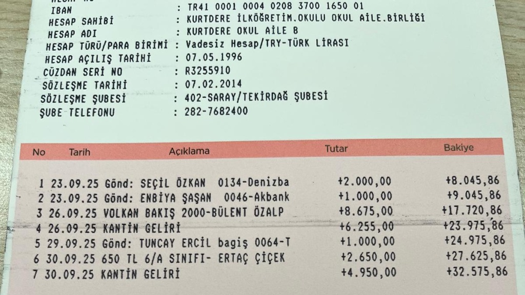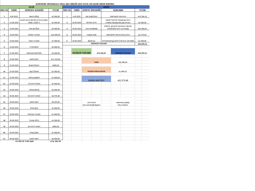 Kurtdere Ortaokulu 2025 Eylül Ayı Okul-Aile Birliği Gelir Gider Tablosu